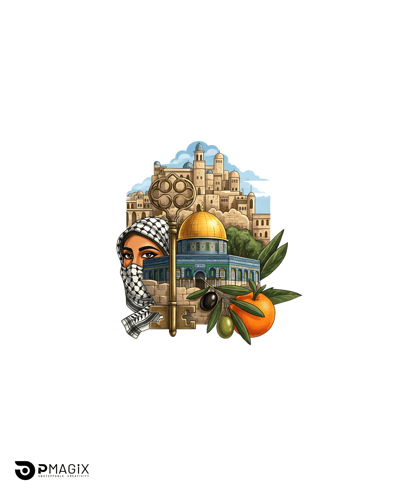 • This design unites iconic Palestinian symbols in one artistic composition, centered around the “Key of Return” which represents the right of the Palestinian people to their homes.