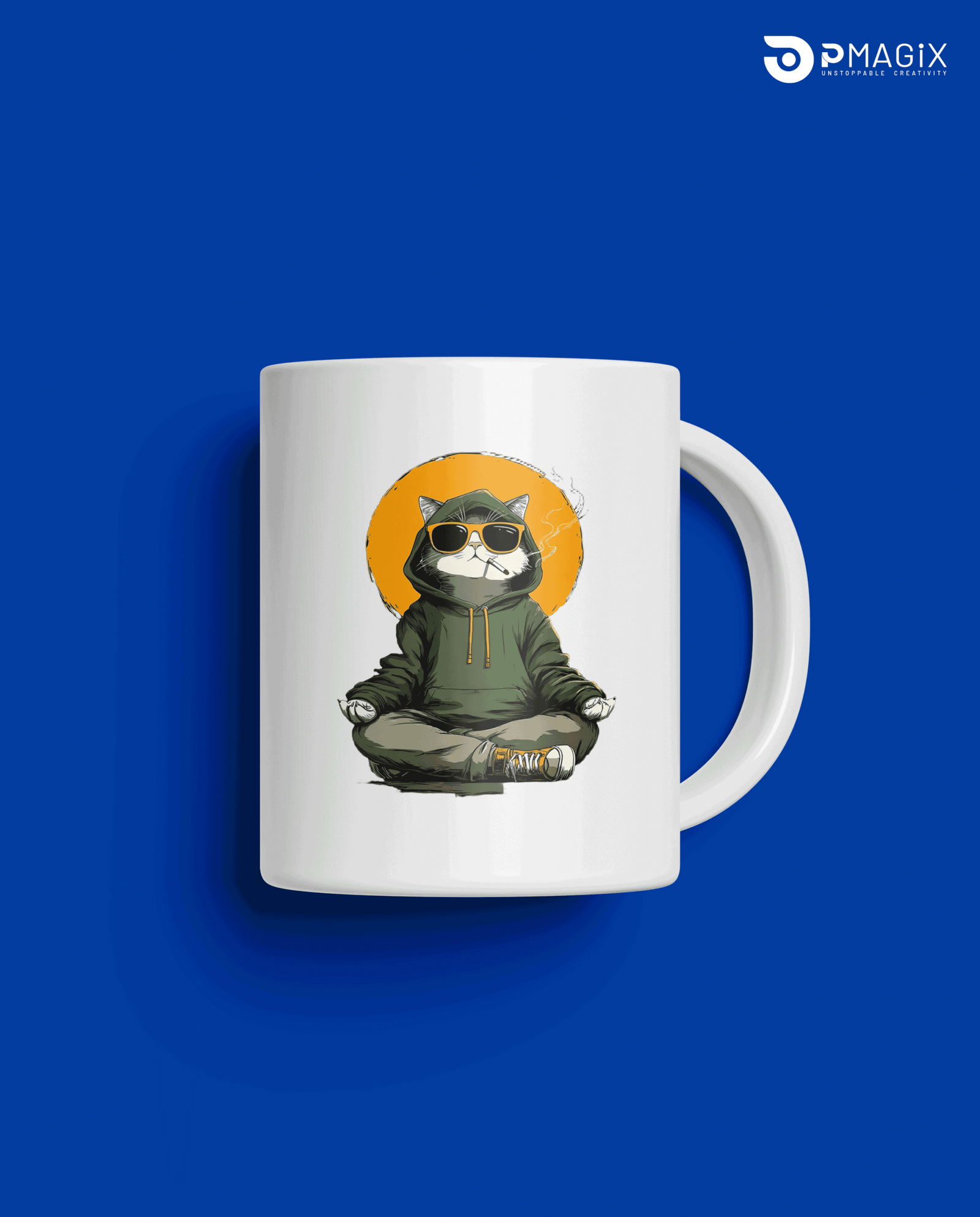 A unique design that blends modern streetwear culture with a calm, meditative vibe. Featuring a cool cat in a hoodie and sunglasses in a total state of relaxation, this artwork adds a touch of humor and personality to your day.