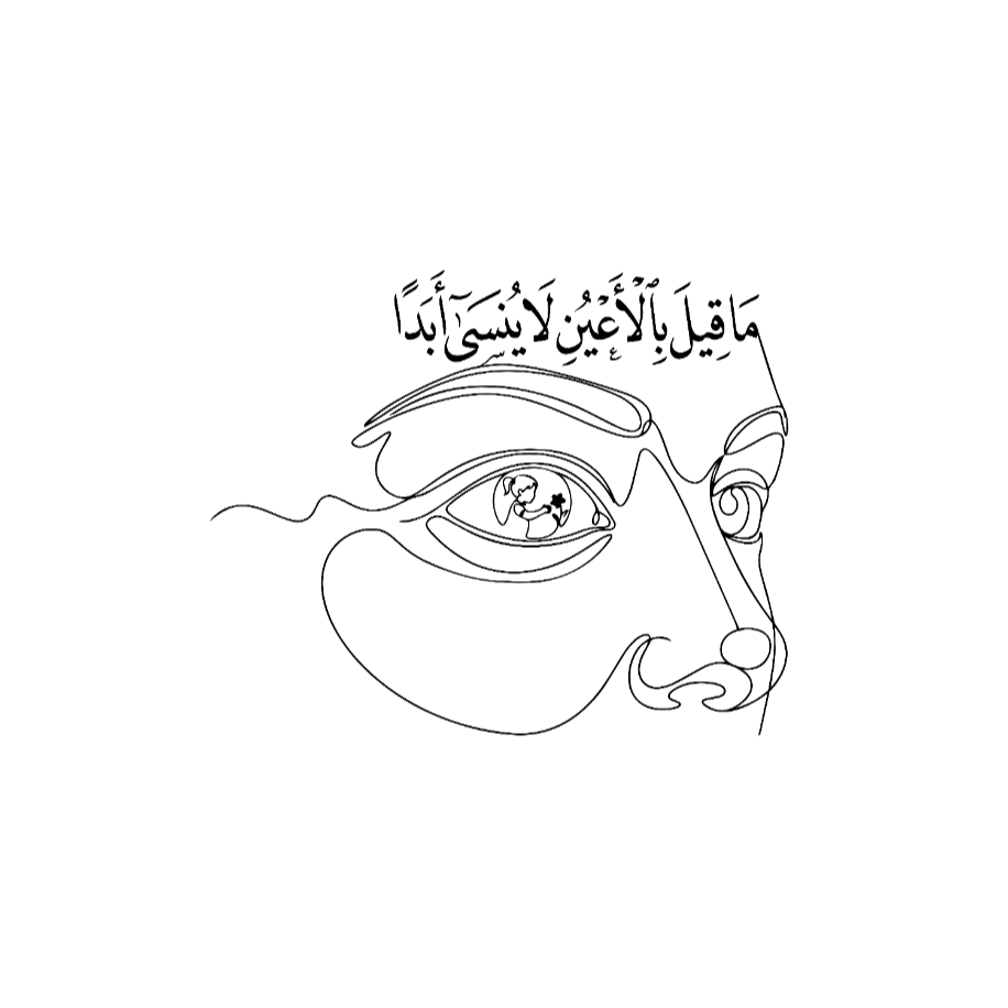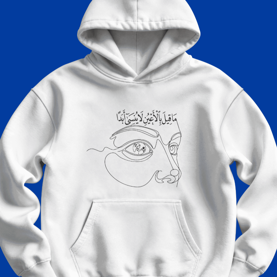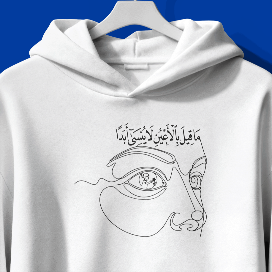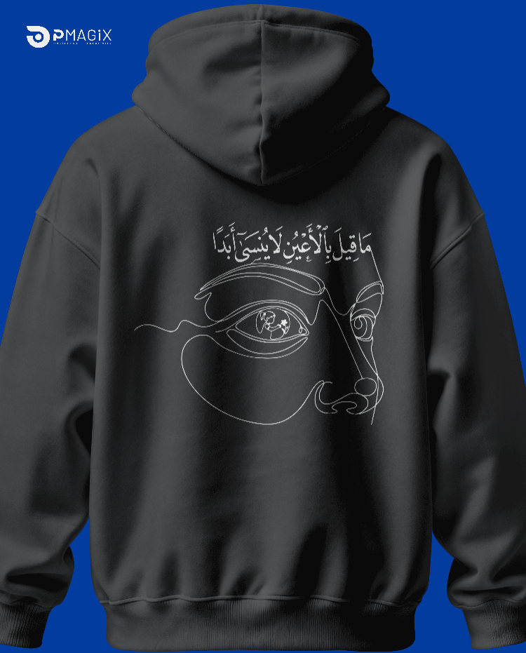 A modern hoodie blending Arabic calligraphy with minimal line art, inspired by the phrase: “What is said through the eyes is never forgotten.”