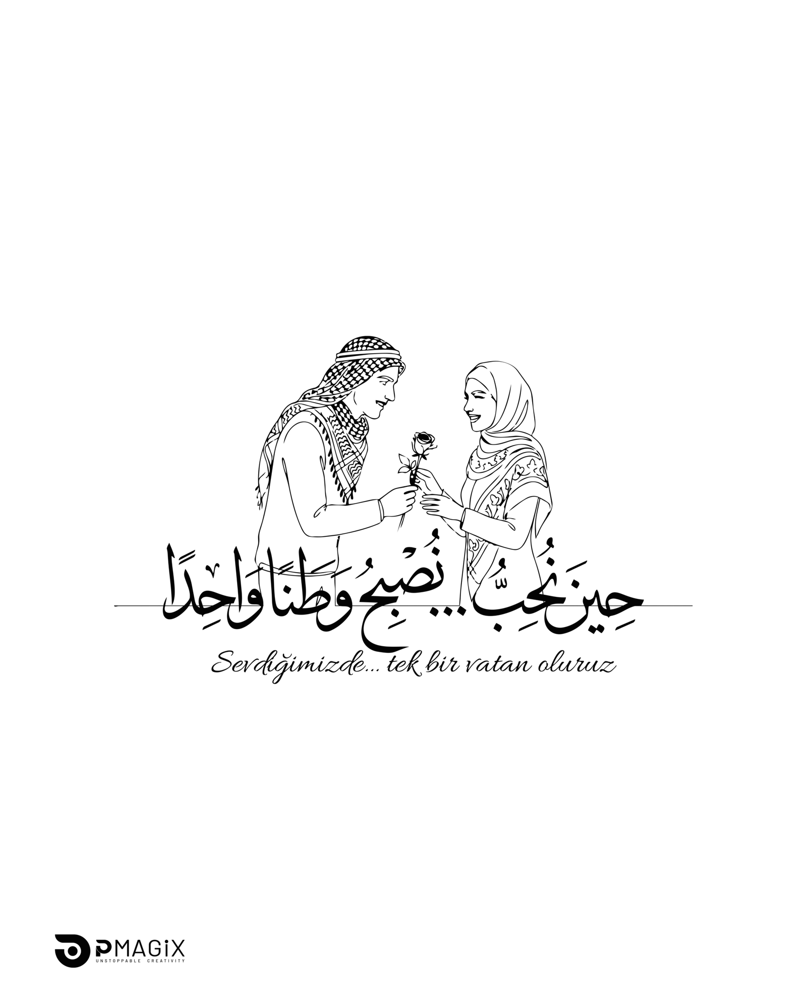 • The Message: Centered in the design is the phrase “When we love.. we become one homeland” in elegant Arabic calligraphy, with its Turkish translation below, emphasizing that love and belonging are the core of a nation.